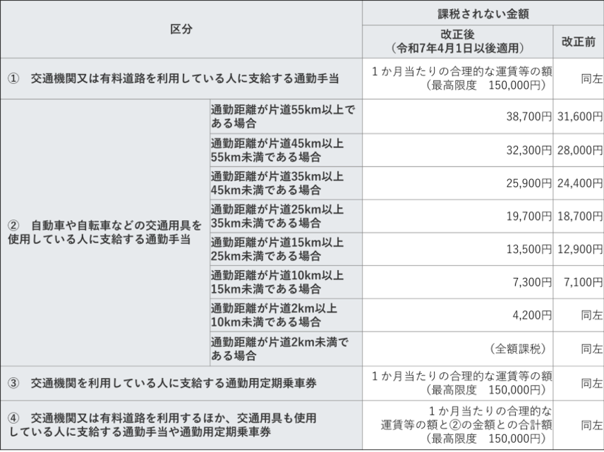 自転車通勤の交通費は非課税になる? 人事キーワード・ノウハウ 公開日:2026年02月13日(金) 近年、健康志向や環境意識の高まりを背景に、自転車通勤を選ぶ人が増えています。満員電車のストレスから解放され、運動不足の解消にもつながる自転車通勤は、働き方の多様化の一環として注目されています。一方で、「自転車通勤でも交通費は支給されるのか?」「その交通費は非課税になるのか?」といった疑問を持つ方も多いのではないでしょうか。 この記事では、自転車通勤における交通費の非課税制度や、従業員・企業双方のメリット、導入時に企業が注意すべきポイントについて詳しく解説します。 目次自転車通勤の交通費は非課税になるのか自転車通勤制度を導入するメリット自転車通勤制度の導入にあたって会社が検討すべき3つのケースまとめ 自転車通勤の交通費は非課税になるのか 自転車通勤に対して交通費を支給する場合、一定の条件を満たせばその費用は非課税となります。 これは国税庁が定める「通勤手当の非課税限度額」に基づいており、その通勤方法や経路が最も経済的かつ合理的な経路および方法に該当する場合に適用されます。 非課税となる1ヶ月あたりの支給限度額は、通勤に要する片道の距離(直線距離ではなく、実際の通勤経路に沿った距離)に応じて、次のように定められています。 自転車通勤距離と非課税限度額 出典:国税庁「通勤手当の非課税限度額の改正について」 例えば、山手線の平均駅間距離が1.15kmですので、山手線近辺で自転車通勤を考えている方の場合、非課税額が適用される2kmを超えるには約2駅分の距離を自転車で通勤する必要があります。 ここで、実際に自転車通勤を検討する際には、片道20〜30km以上の距離となると現実的な選択肢とは言い難いでしょう。 つまり、自転車通勤制度を導入する場合、非課税の通勤手当として多くても約1万円程度の支給が一般的と言えますが、それ以外にどのようなメリットがあるのでしょうか。 自転車通勤制度を導入するメリット 自転車通勤制度を導入することは、従業員の健康面・経済面の利点に加え、企業イメージの向上やコスト削減などが期待できます。 ここでは、従業員側・会社側それぞれの視点から、自転車通勤制度を導入することのメリットを詳しく見ていきましょう。 従業員側のメリット 中・近距離の効果的な移動 自転車は渋滞の影響を受けず、鉄道の待ち時間や駐車場探しの手間も不要なため、一定の距離内であれば最も所要時間が短く、時間通りの移動が可能です。 そのため、中・近距離の通勤においては、他の交通手段と比べて効率的で安定した移動手段と言えるでしょう。 出典:自転車活用推進官民連携協議会「自転車通勤導入に関する手引き」 上の図は交通手段別の移動距離と所要時間の関係を表した図です。実際に約500mから5km程度の距離において、所要時間が最も短いことが確認できます。 身体面の健康増進 自転車による運動は、脂肪燃焼や体力向上の効果が期待でき、脚部や体幹部の筋肉を使うことにより筋力の維持・増強に役立ちます。 その結果、運動不足が一因となる各種疾患の予防が期待できるでしょう。 精神面の健康増進 自転車通勤は、徒歩や車では得られない心地よさがあり、加えて適度な運動などによって、気分の改善やメンタルヘルスの向上につながります。 さらに、都市部においては、満員電車に乗ることなく快適に自転車で通勤することができることもメリットの一つです。 会社側のメリット 経費の削減 自転車は車や公共交通に比べて通勤にかかる費用が少ないため、通勤手当の削減につながります。 また、車から自転車通勤への転換が図られることで、社用車や駐車場の維持にかかる固定経費などの削減につながります。 生産性の向上 次の図は、3カ月間の自転車通勤によって、働く人の「労働生産性」がどのように変化するのかを調査した結果です。 この調査では、ある企業において自家用車で通勤を行っている20名に対し、自転車通勤を3カ月間実施してもらいました。そして、WLQ-J(※1)という測定ツールを使い、「身体活動」「時間管理」「集中力・対人関係」「仕事の成果」という4つの尺度で表される労働生産性の変化を自記式のアンケートによって評価したものです。 出典:JOYRIDE「通勤サイクリングで仕事の生産性が高まる!?」 自転車に乗って通勤している従業員は、自家用車で通勤している従業員に比べ、心身ともに健康的であり、従業員の健康維持・増進に伴う生産性の向上が期待されます。 (※1)WLQ-Jとは『企業の「健康経営」ガイドブック(経済産業省)』および 『健康経営度調査票』において、推奨されている「プレゼンティーズム=健康の問題を抱えつつも仕事(業務)を行っている状態」を測定するツールです。 企業が自転車通勤を推進することは、環境配慮や従業員の健康促進といった観点から、企業イメージの向上や社会的評価の獲得が期待できます。 加えて、企