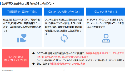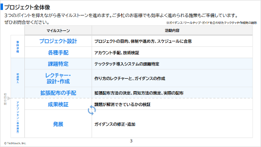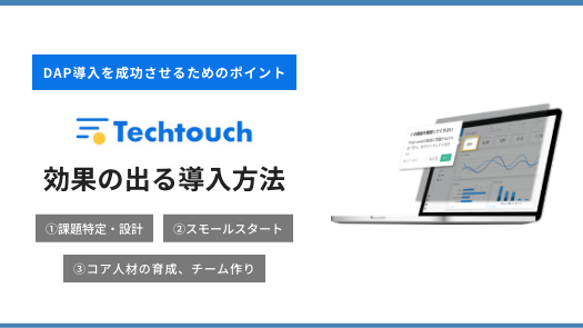 システム上で「操作ガイド」や「入力支援」をリアルタイムに表示させ、誰でも迅速に使いこなせる環境を作るためのコツをご紹介します。 本資料は、DAP(デジタルアダプションプラットフォーム)導入を成功に導くためのポイントやテンプレートを解説した資料です。 テックタッチならノーコードで実現可能 テックタッチは、システム画面上にリアルタイムにガイドを表示させる、DAP(デジタルアダプションプラットフォーム)のサービスです。 操作サポート機能(操作性を向上し、入力ミスや誤操作を防止) 分析機能(活用されていない機能や非効率な操作を発見) フォーム送信完了後、ご入力いただいたメールアドレス宛に資料閲覧用のURLをお送りいたします。