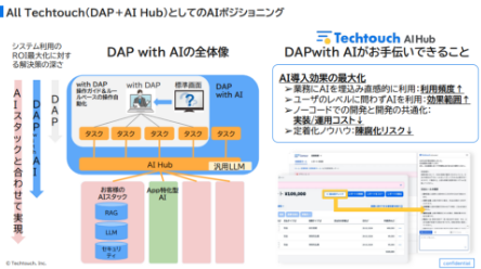 業務システム上で生成AIを活用し、入力支援や検索支援、確認業務の効率化を実現する「AI Hub」について、分かりやすくご紹介します。既存システムに大きな影響を与えずにAIを組み込み、現場で使いやすい形で活用したい方に適した資料です。 AI Hubの概要や特長、活用イメージについて、ポイントを押さえて把握したい方に最適な資料です。 業務システムで生成AIを活用 AI Hubは、対象システムの画面上にボタンを設置し、ワンクリックで生成AIを呼び出せるソリューションです。画面内の情報を取得して文脈を補完できるため、プロンプト入力なしでも、利用シーンに応じた支援を実現できます。自然言語による検索、入力内容のチェック、文章の整形、有識者視点での確認支援など、さまざまな業務に活用でき、システム利用の定着化と業務効率化を支援します。 ワンクリックでAI起動 プロンプト入力不要 自然言語で検索可能 入力内容を自動チェック 文章作成・整形を支援 フォーム送信完了後、ご入力いただいたメールアドレス宛に資料閲覧用のURLをお送りいたします。