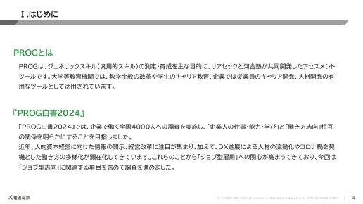 ジョブ型雇用に向け、働き方・能力・学びの関係を多角的に解明 企業で働く4000人を対象に、ジェネリックスキル測定ツール「PROG」の受験とともに、仕事に関するアンケート調査を実施した結果をご紹介します。 資料から分かること この資料の目次ジェネリックスキルと仕事能力・学び行動との関係ジョブ型/メンバーシップ型雇用の意識と実態人的資本経営の可視化に向けた課題まとめ フォーム送信完了後、ご入力いただいたメールアドレス宛に資料閲覧用のURLをお送りいたします。